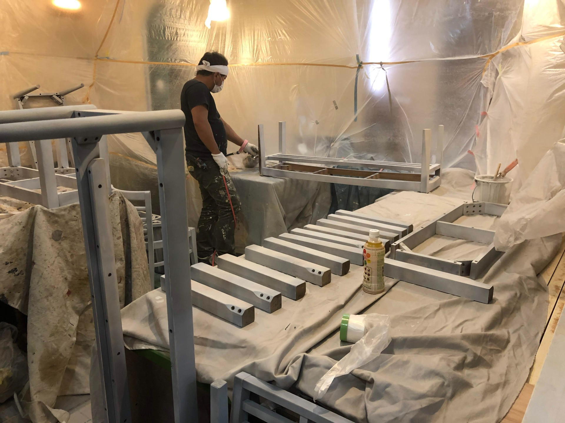 椅子、ベンチの塗り替えと張り替え 2020/06/03 椅子、ベンチ、ソファーの塗り替え、張替えを行いました 家具工事 黒ファブリック×黒塗装 厚手の生地で張替しました グレー×ビニールレザー レザーは定番のシンコール製オールマイティー 合皮で悩んだらこちらにしておけば品質 コストパフォーマンス共に間違いない ソファー張り替え レザーはシンコール製オールマイティ 塗装はスプレー塗装 スプレー塗装中! 家具の塗装なので、今回はスプレー塗装です!カップガンという機械で塗料を吹付します! カップガン はめちゃくちゃ種類が多くて、今回使ってる物は一般的なカップガン ですが、外壁の吹付で使うガンはリシンガンという物や、塗料を温めて粒子が細かくなおかつ乾きが早く出来る温風ガンという物もあります! 実は私も一つだけカップガン持ってます!笑 なんでもやってみたいというのと、自分でも各工種の作業を理解した上で、専門業者にお願いする部分はお願いしたいので、割と全工種の道具一通りは持っています^_^ 最新のブログ記事はこちら 家具什器工事のブログ記事 2026/01/27 キッチン工事の図面作成 2025/10/07 棚製作 2025/10/04 丸テーブル製作続編 店舗工事