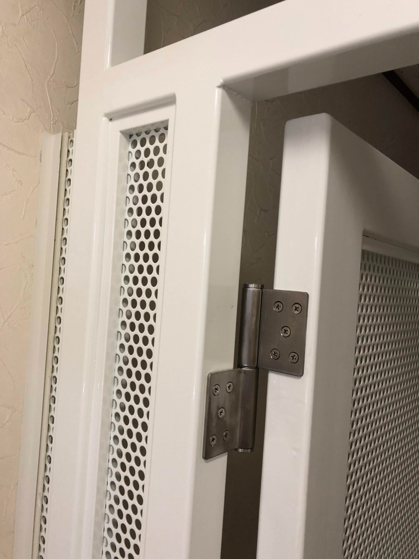 スチールドアを製作! 2020/05/28 パンチングメッシュのドア スチールドアを製作! 鍵はGoal製シリンダー鍵 据付後! パンチングメッシュドア ビルの内廊下に鋼製建具を新設! 今回はビルの内廊下に鋼製建具を新設しました! 両袖壁はたちが悪かったので、当初一体物で製作する計画でしたが、一体物で製作すると入らない為、設計変更して分割式にして納めました! 天井下地と床で強度を持たせています。 パンチングメッシュは一部現場カットして組込ました! 鋼製建具もE.M.Worksまで! その他工事
