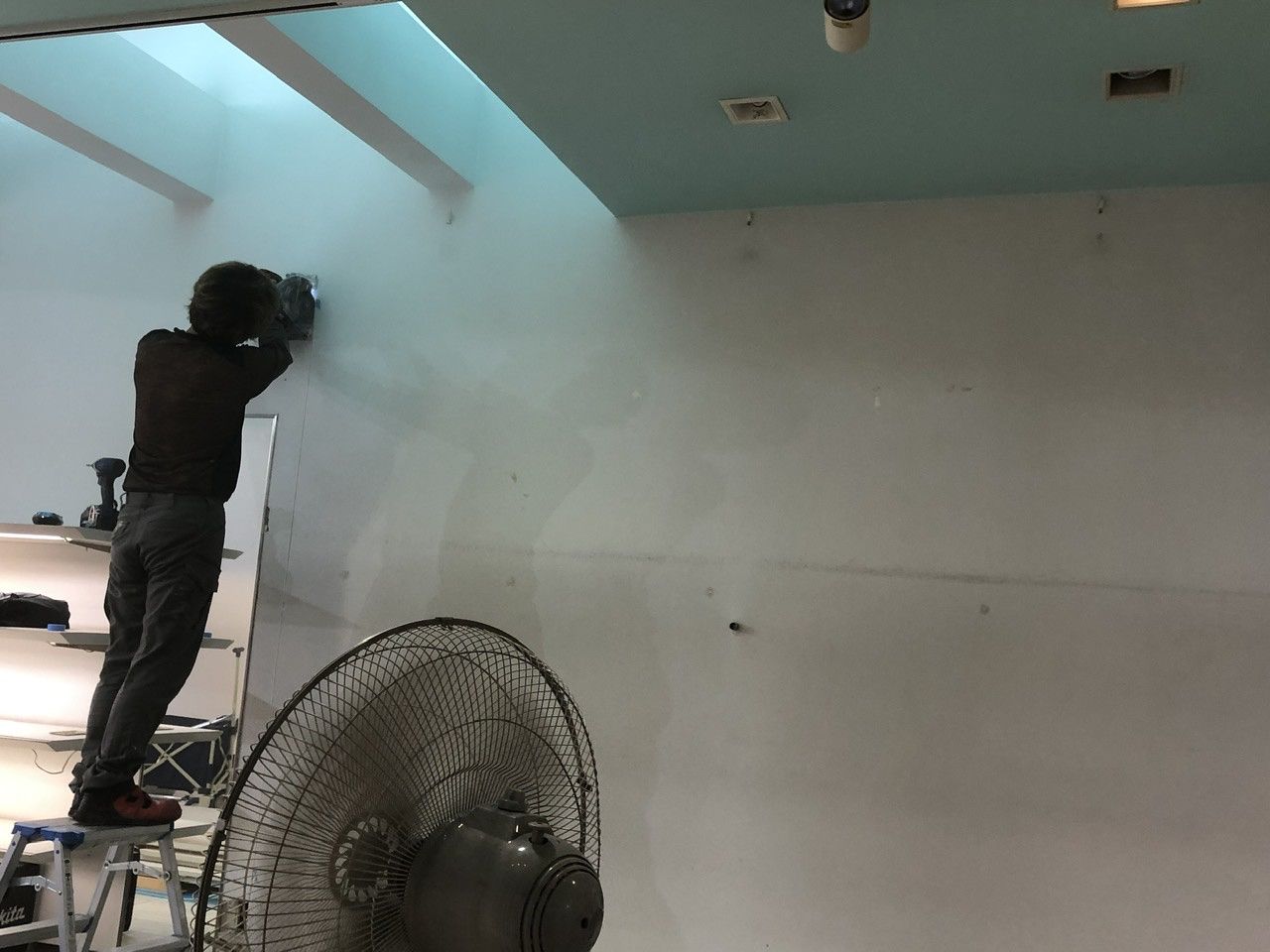 この現場は工期がタイトな現場の為、昼は音の出る造作工事、夜は音の出ない塗装工事に一日2部制で進めていきます。