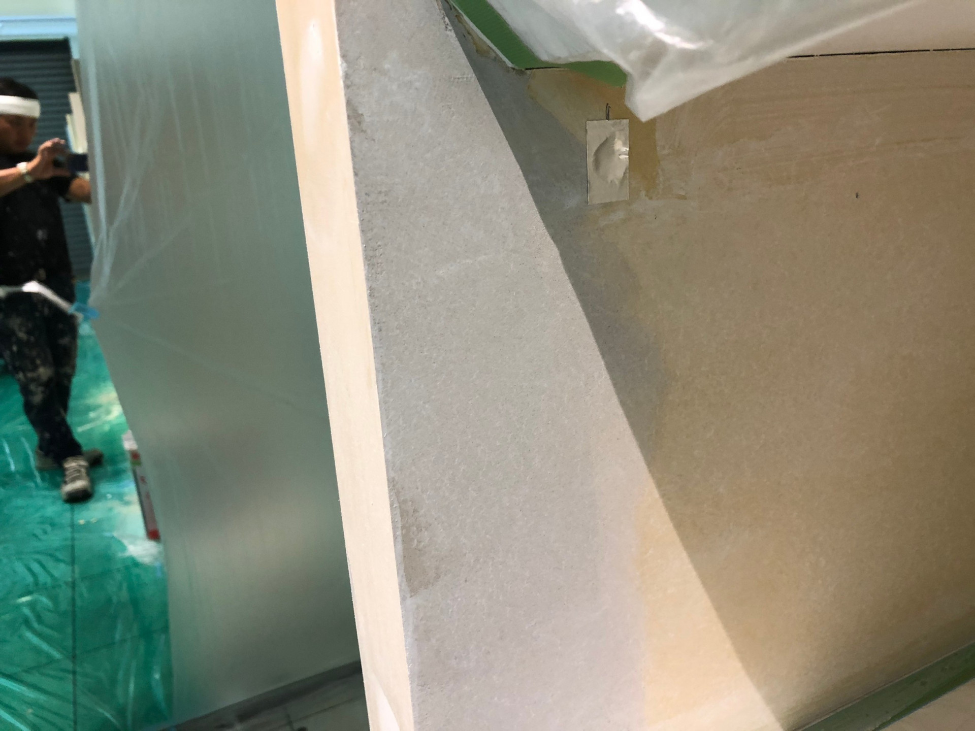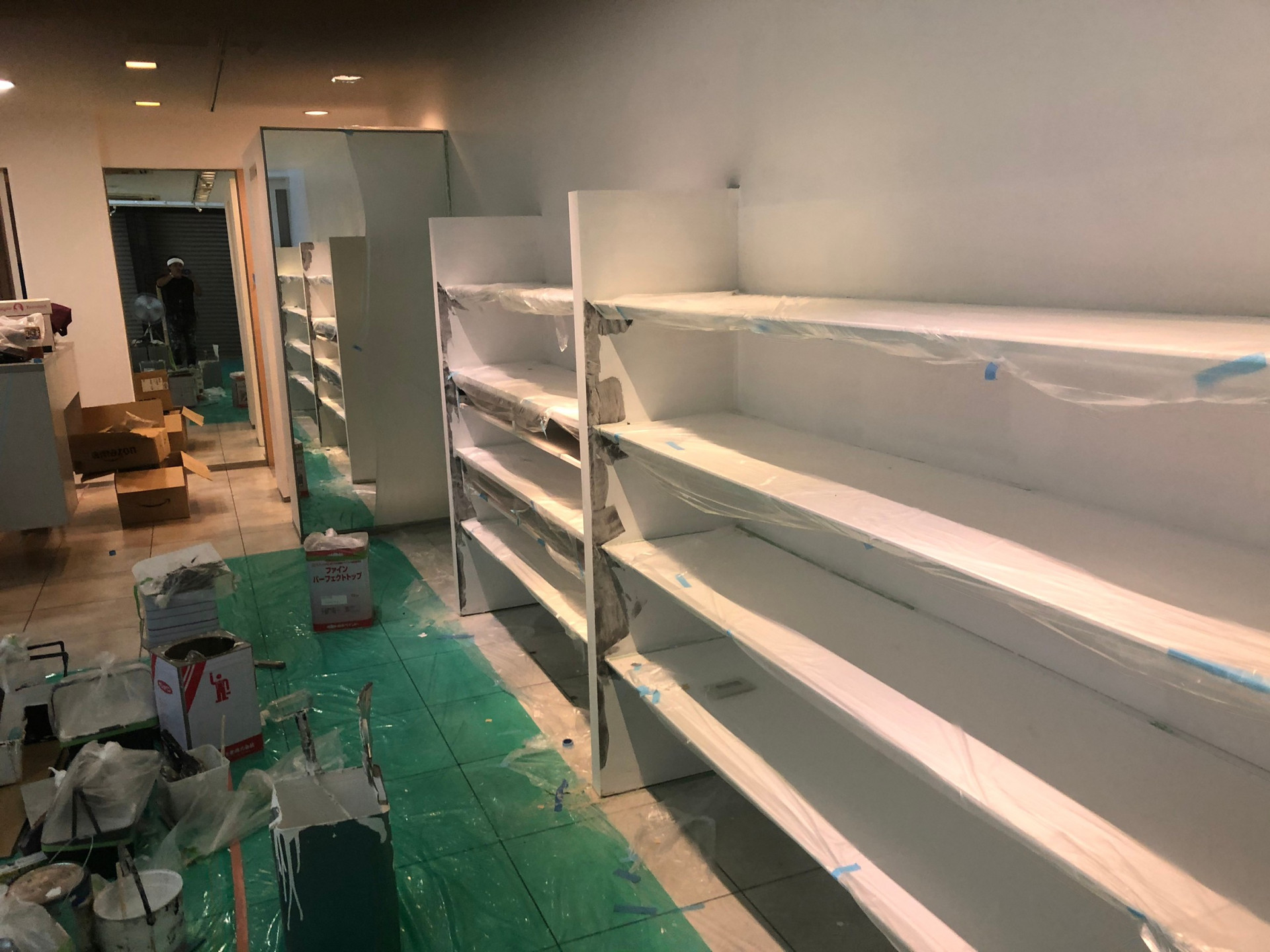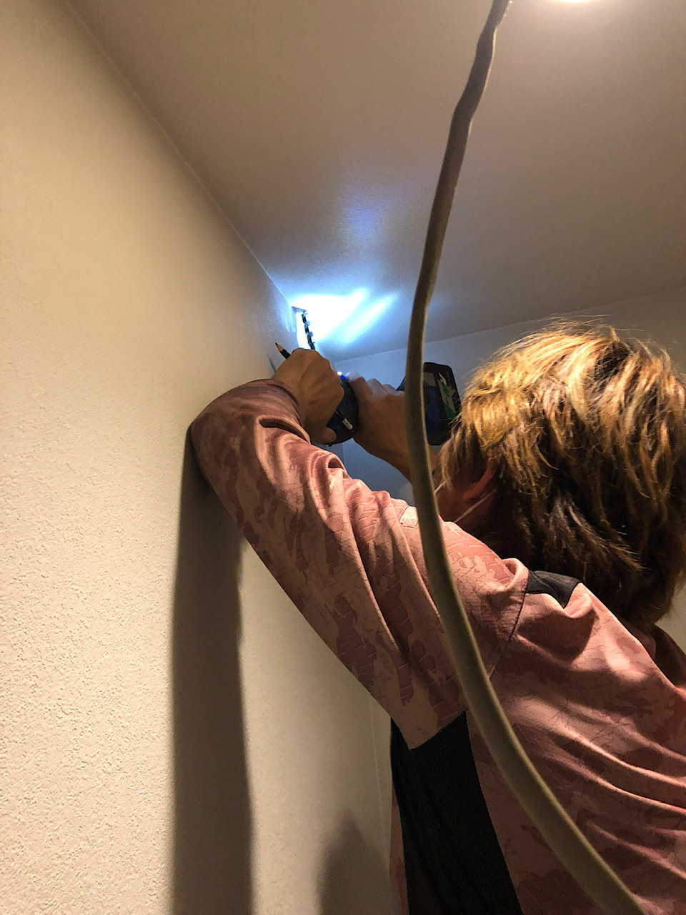 天神橋着物屋さん工事 電気工事編 2020/09/01 トイレに新設コンセント設置 ウォシュレットにはコンセントが必要です タイル下地で埋め込めないので露出配線です 後付けなので、露出配線です この後モールを貼って電線を隠します 天井へ入線の為の穴開け 一度換気扇を外して経路を確認しました 棚の照明用電源仕込み 照明を後から増設できるように仕込んでおきます 棚下照明用電源穴 アルミテープで塞ぎます(あとで剥がしやすいように)ここは塗装すればあまり目立たなくなります フラットにします パテ作業 パテ完了後塗装します 綺麗にしすぎて電線穴探すの大変ですね((+_+)) 最新現場記事はこちら 2026/02/15 東京大神宮へ向かう道路沿いの現場調査|立地の力を感じた一日 2026/02/09 大学キャンパスにテレワークブースを設置|設置作業の流れと所要時間を解説 2026/02/01 間仕切り壁位置変更工事 店舗屋の裏側