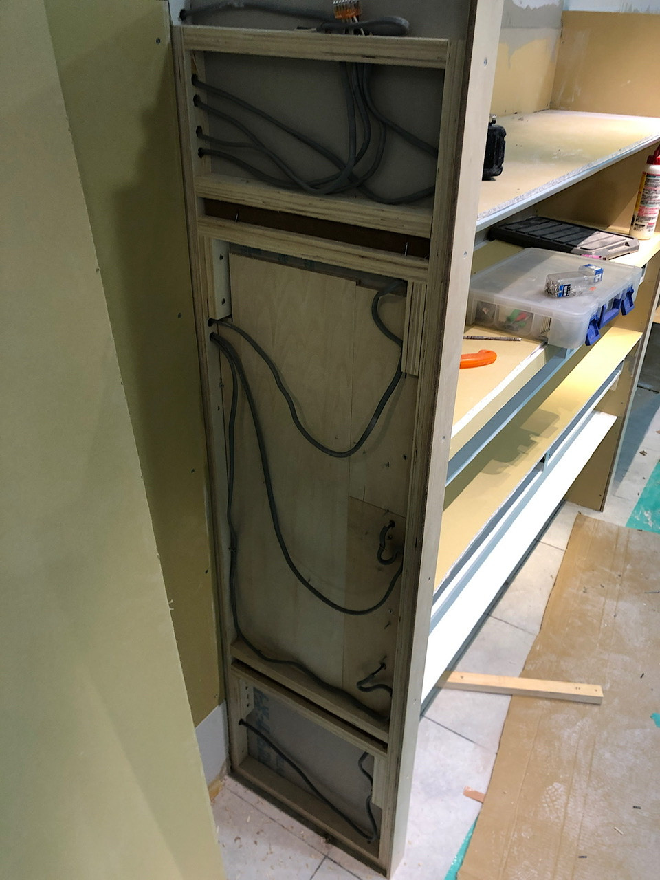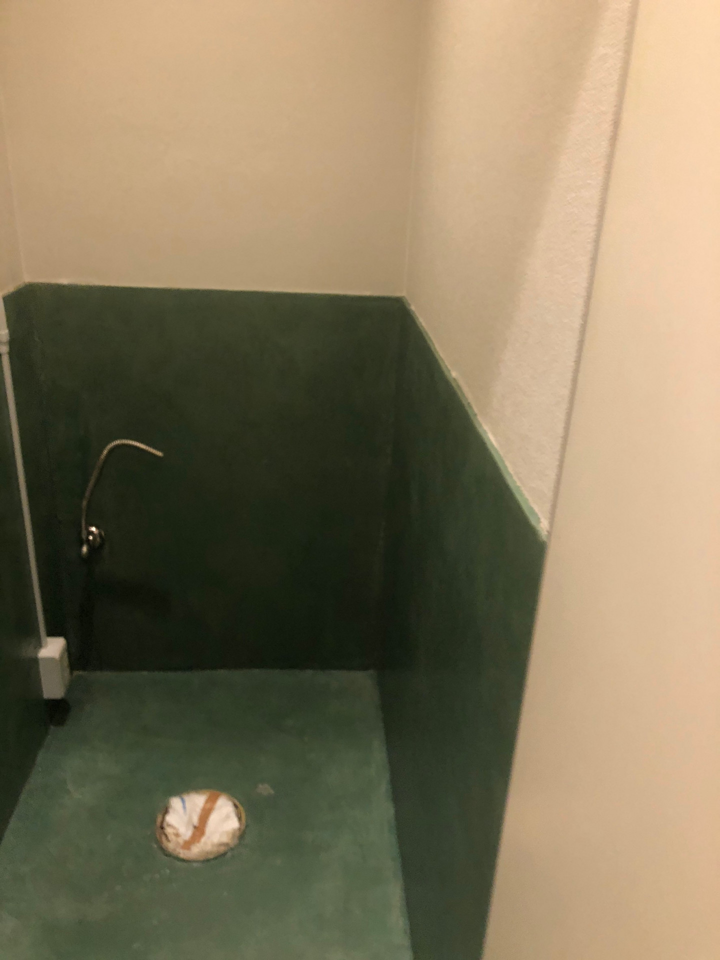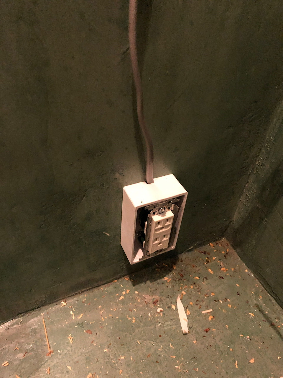 天神橋着物屋さん工事 電気工事編 2020/09/01 トイレに新設コンセント設置 ウォシュレットにはコンセントが必要です タイル下地で埋め込めないので露出配線です 後付けなので、露出配線です この後モールを貼って電線を隠します 天井へ入線の為の穴開け 一度換気扇を外して経路を確認しました 棚の照明用電源仕込み 照明を後から増設できるように仕込んでおきます 棚下照明用電源穴 アルミテープで塞ぎます(あとで剥がしやすいように)ここは塗装すればあまり目立たなくなります フラットにします パテ作業 パテ完了後塗装します 綺麗にしすぎて電線穴探すの大変ですね((+_+)) 最新現場記事はこちら 2026/02/15 東京大神宮へ向かう道路沿いの現場調査|立地の力を感じた一日 2026/02/09 大学キャンパスにテレワークブースを設置|設置作業の流れと所要時間を解説 2026/02/01 間仕切り壁位置変更工事 店舗屋の裏側