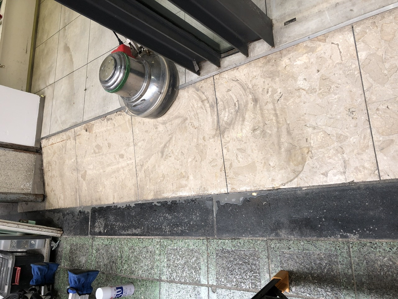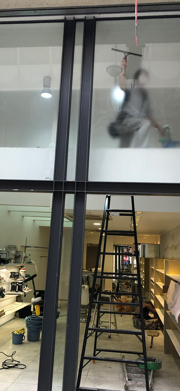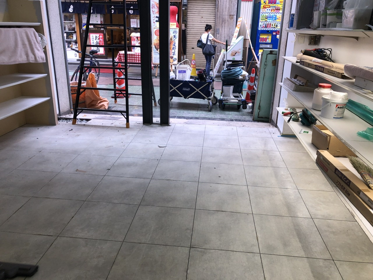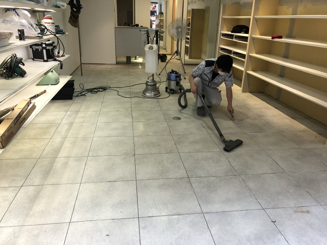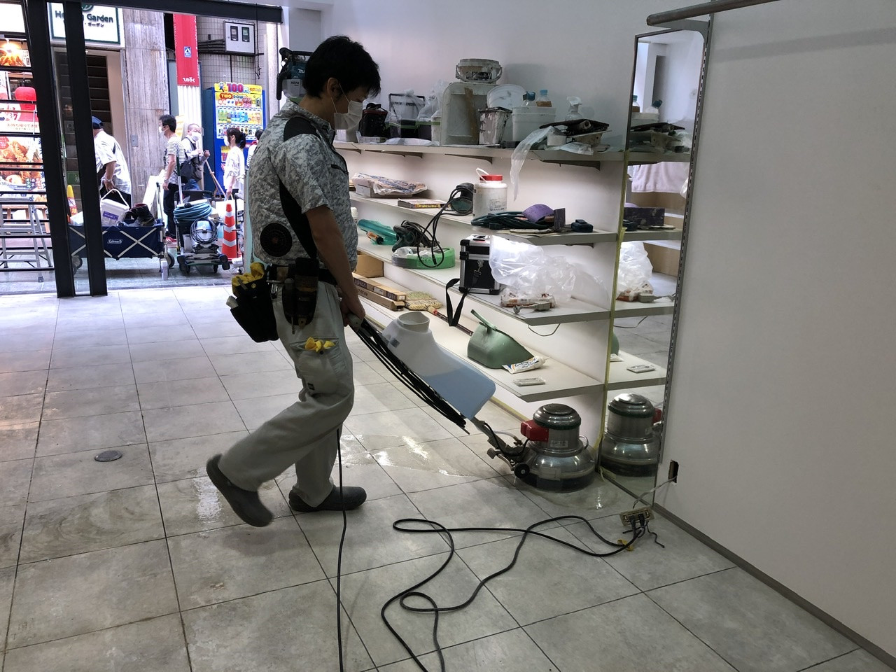 天神橋着物屋さんの美装工事! 2020/09/02 美装は上から下に掃除していきます まずは窓清掃! この現場用で買った10尺脚立! 無駄に黒色!(色の指定はしてません) ポリッシャーかけていきます スポンジやブラシのついた円盤が回転する機械です 汚れが落ちていきます 2期工事で床も貼る予定です 細かい汚れを手で取ります 最後にワックスかけて終了! 店舗工事