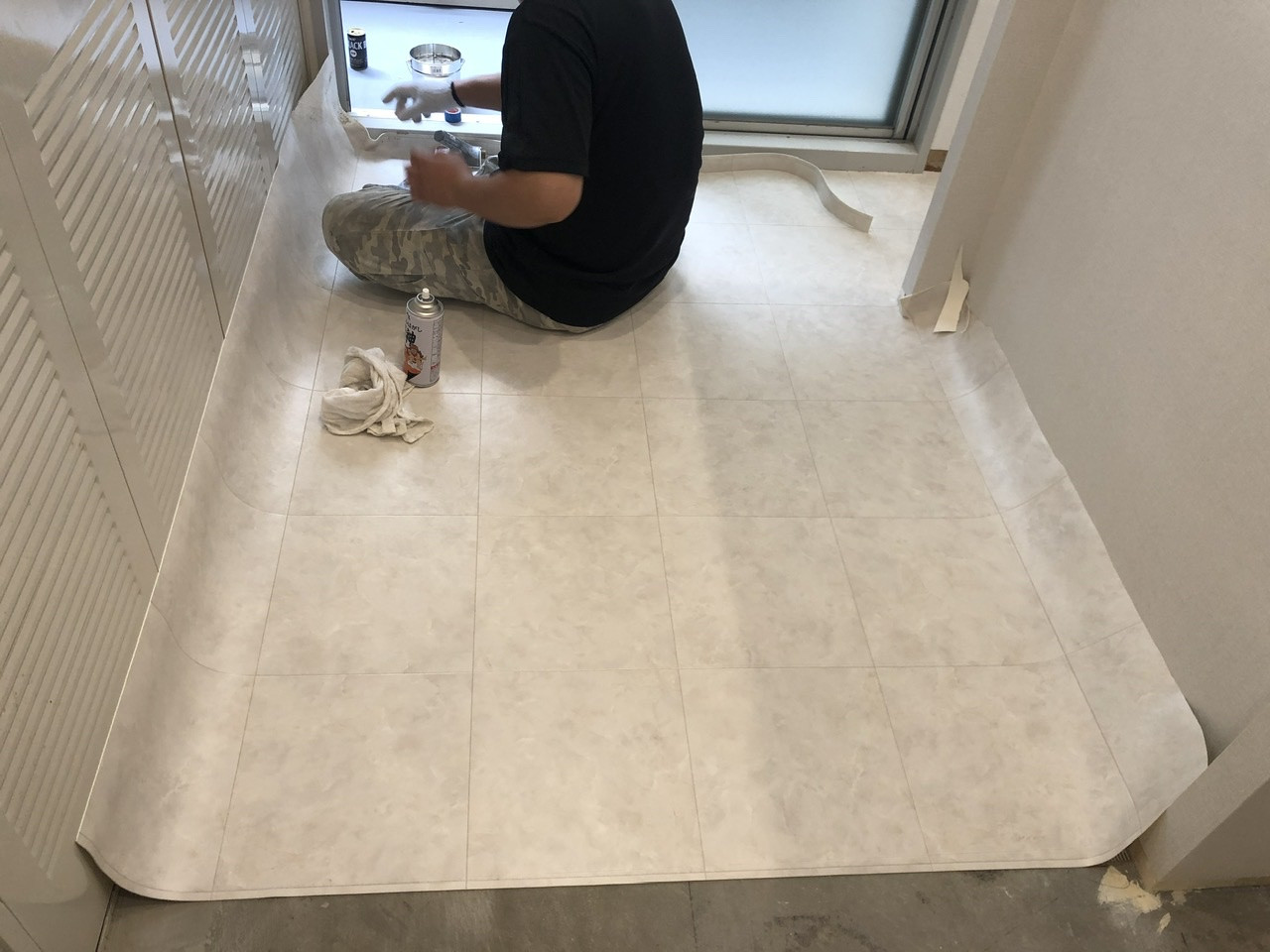 クッションフロアは薄いので下地の凹凸をもろに拾いますので念入りな下地調整を行いました。