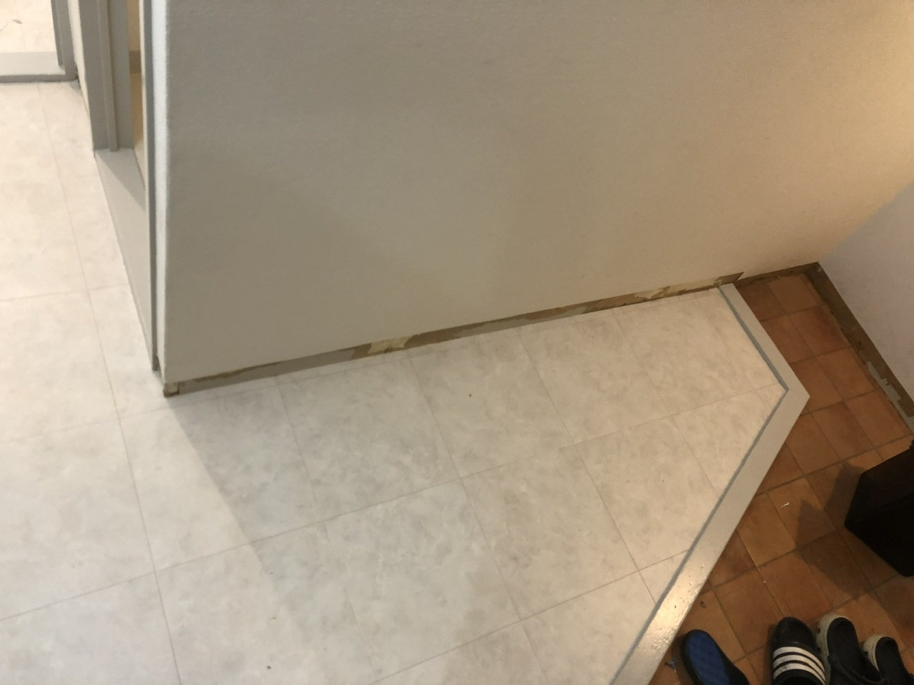 この物件、過去にロールカーペット、そして和室の跡があるので畳、その後タイルカーペットとリフォームが重ねられていました。