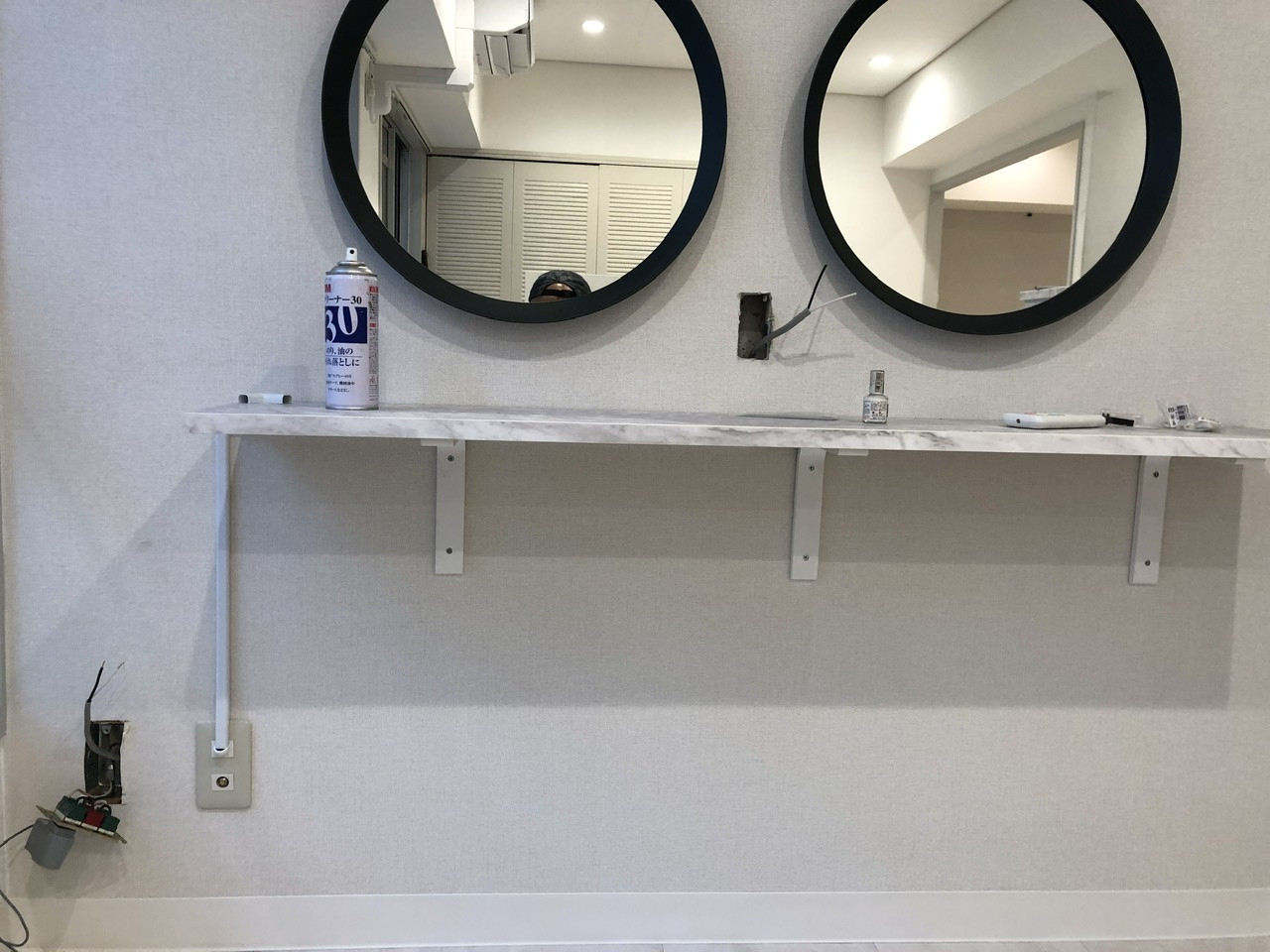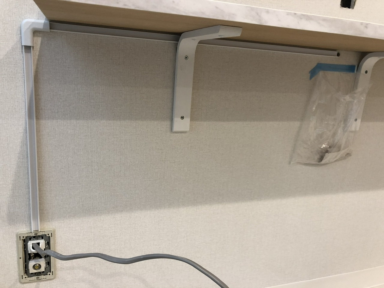 クロスも仕上がり、化粧カウンターも付いた後でしたが、お客様からカウンターの上にコンセントを追加して欲しいとの要望を受けたのでなるべく目立たないように線を通して取付しました。