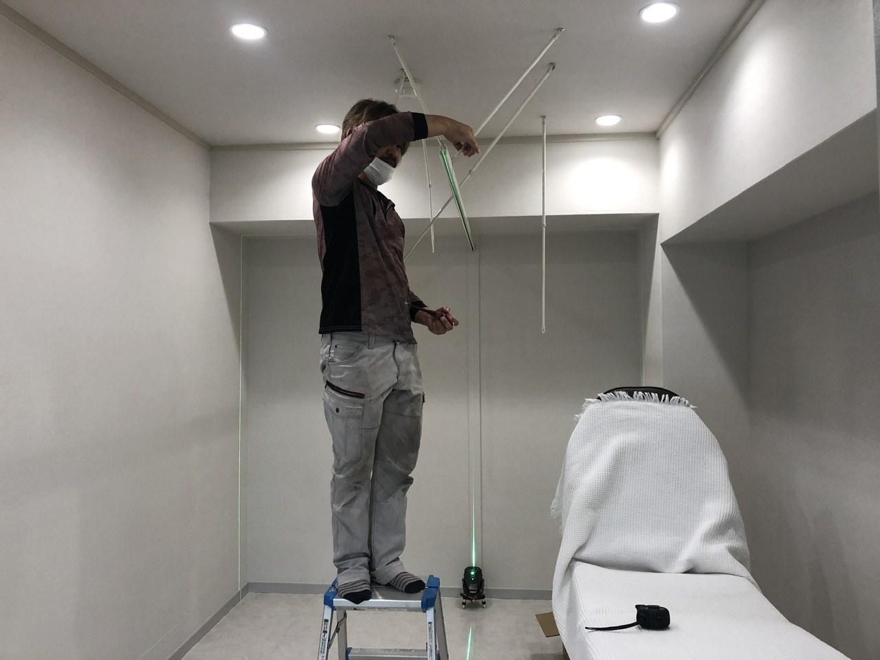 そしてメイン照明をダウンライトに変更して、局所照明としてライティングダクトレール(通称ショップライン)を取付しました。ショップラインにはお客様の方でペンダントライトをつけてもらう計画です!