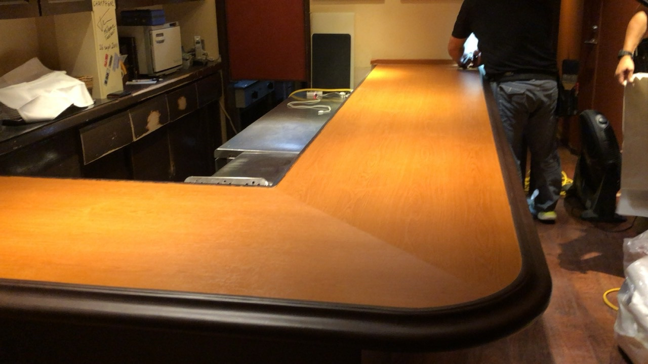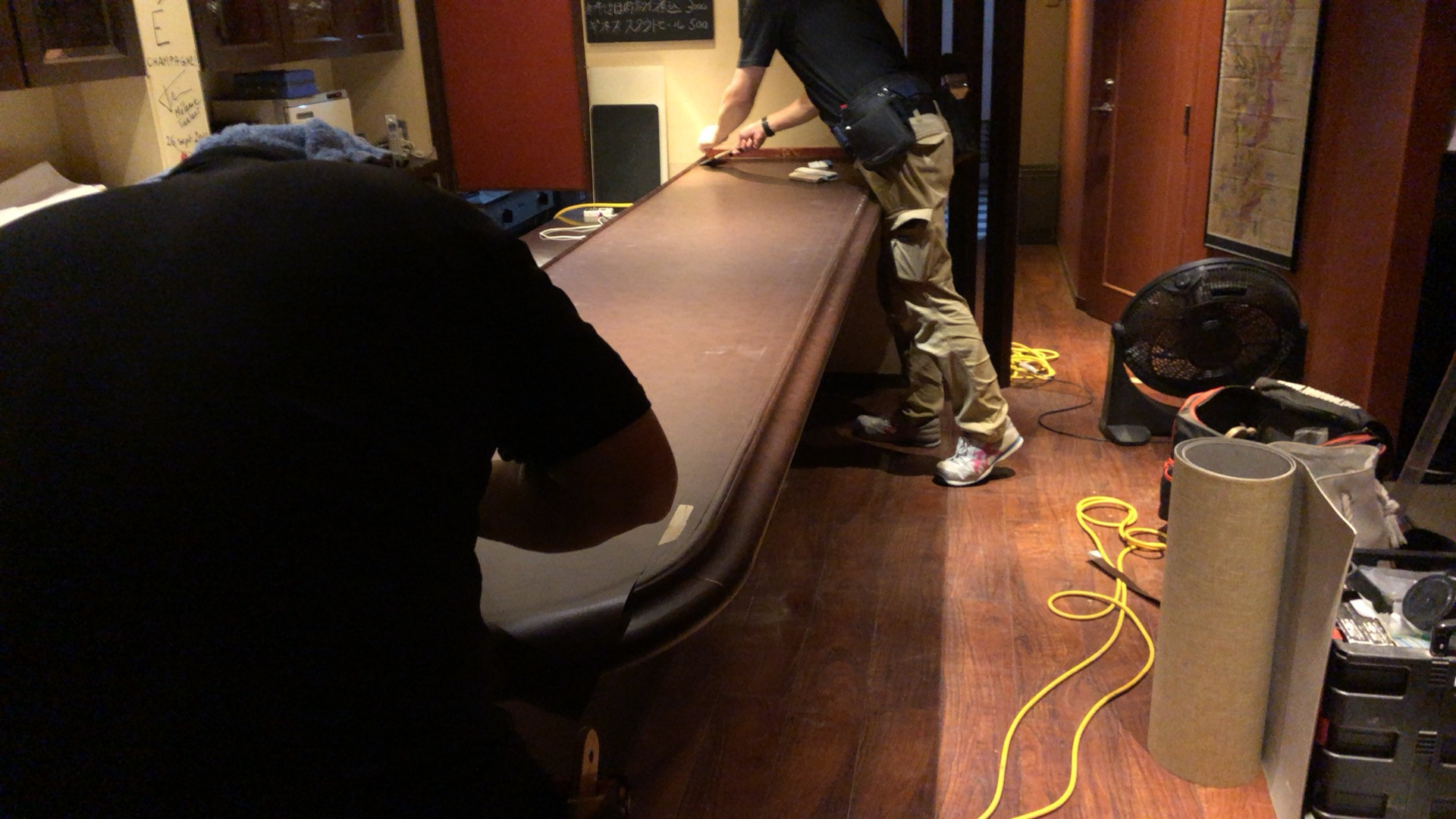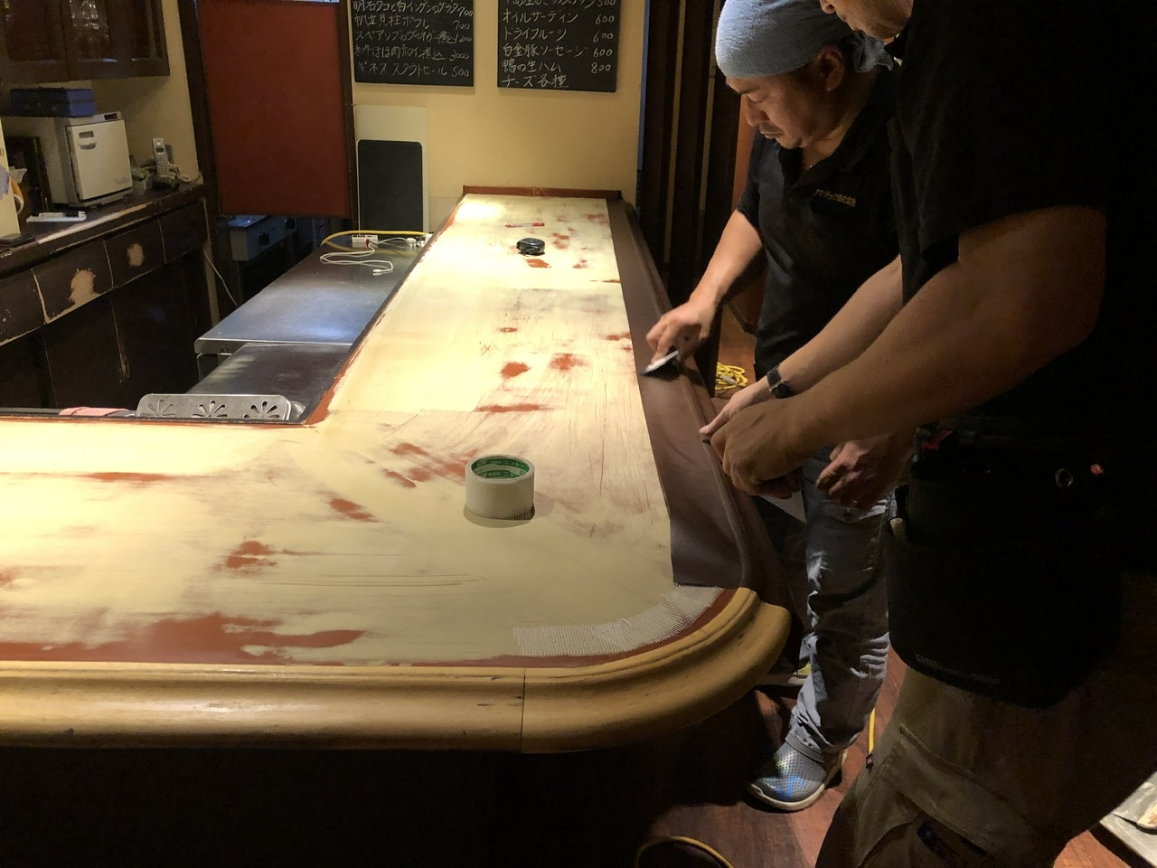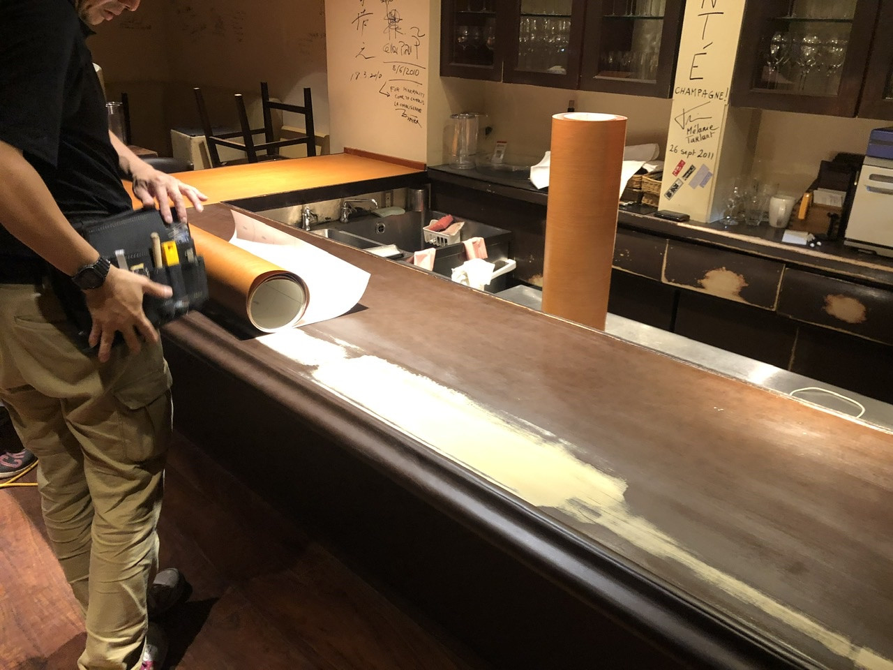 【ランジュヴァン】様にてカウンターを綺麗にしたいとのお問い合わせがあり、ダイノックシートの施工を行いました。