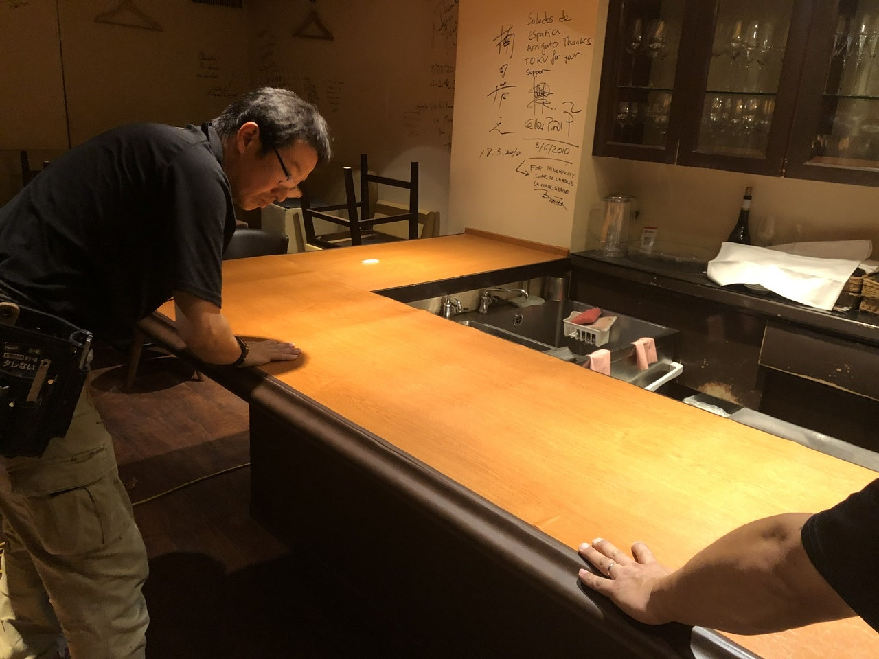 大阪で店舗改装、店舗リフォームに伴うカウンターの改造、ダイノックシート工事もE.M.Worksまでお問合せください!