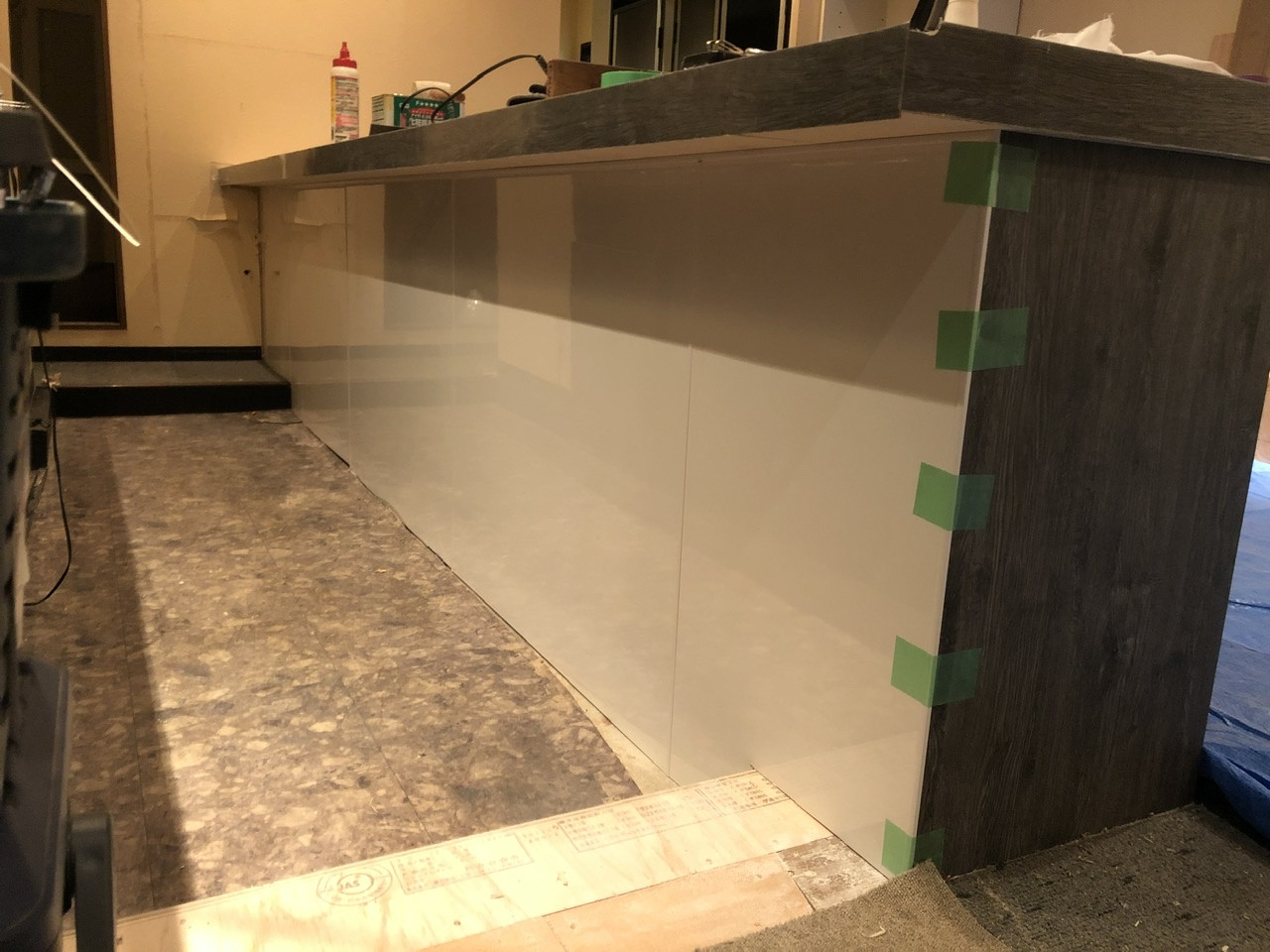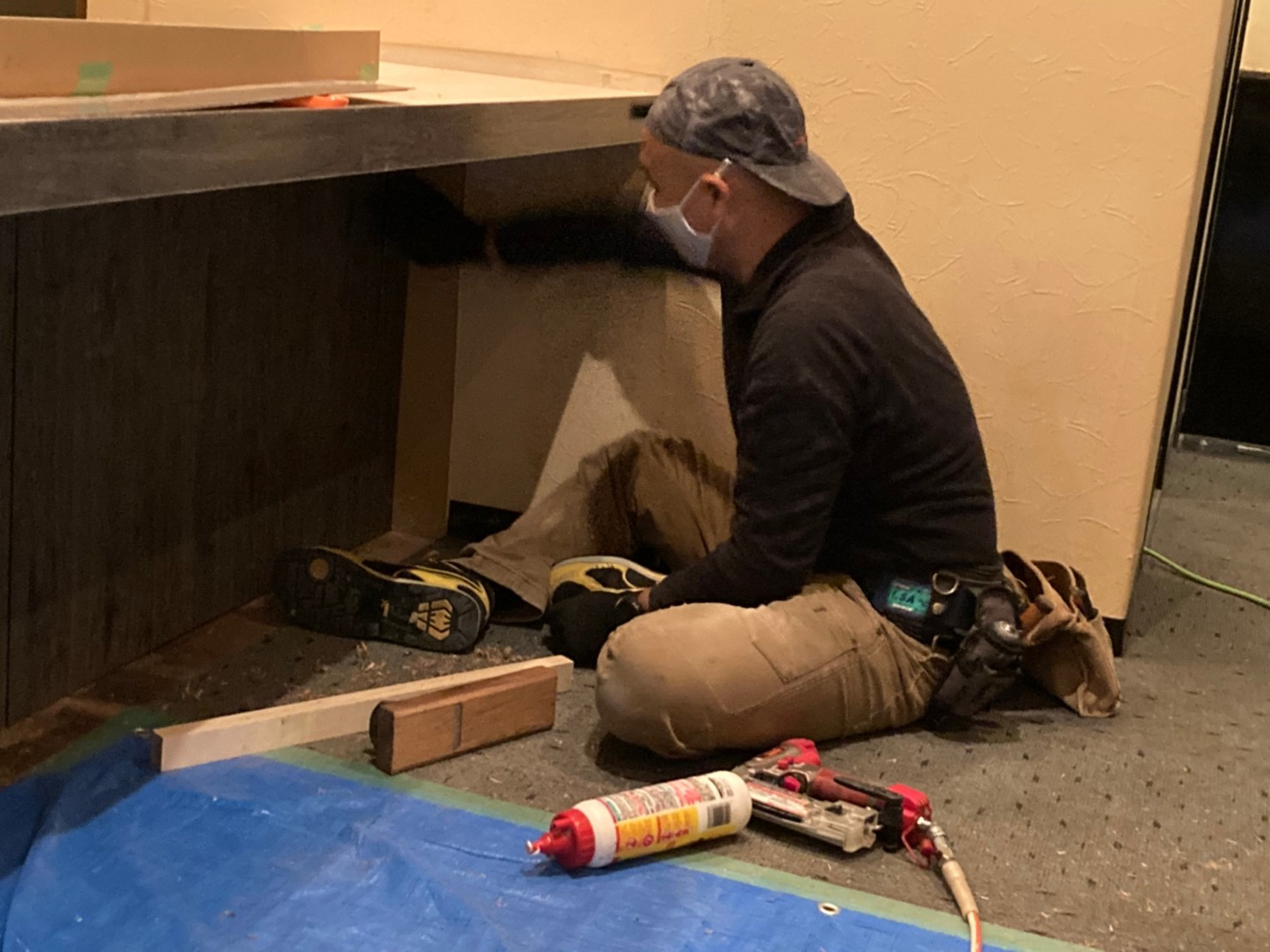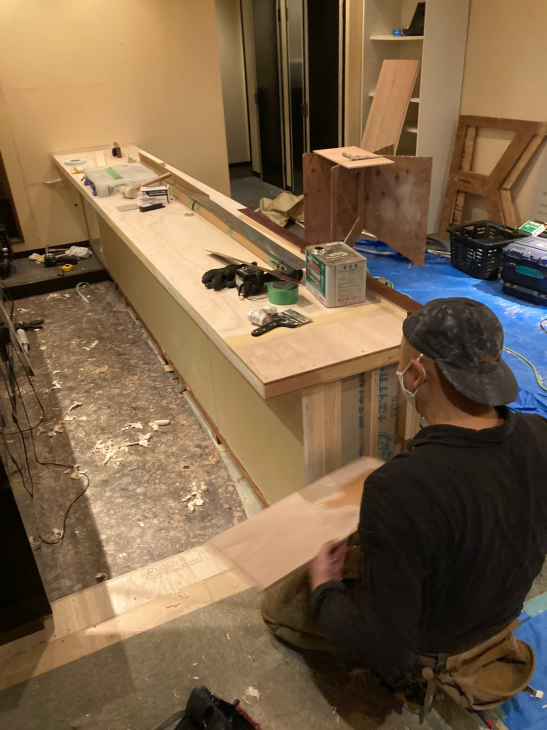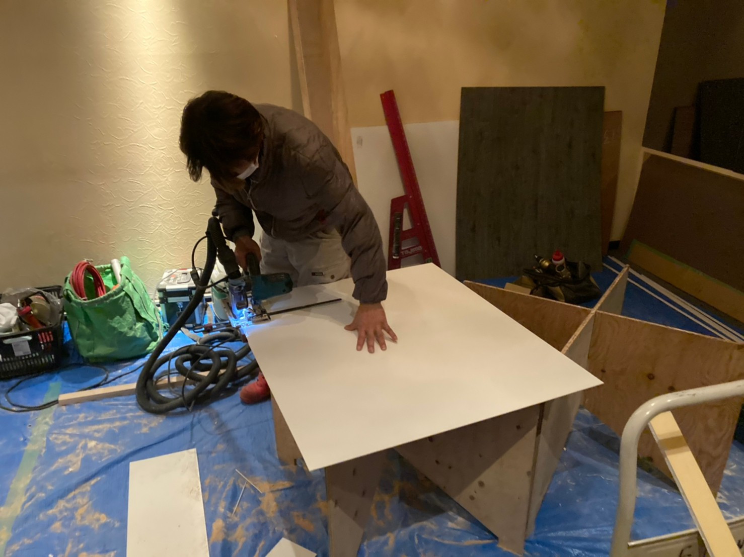 腰壁部分やカウンターの天板の部材は全て事務所にてカット済みだったので、現地では組み立てと仕上げを行いました!