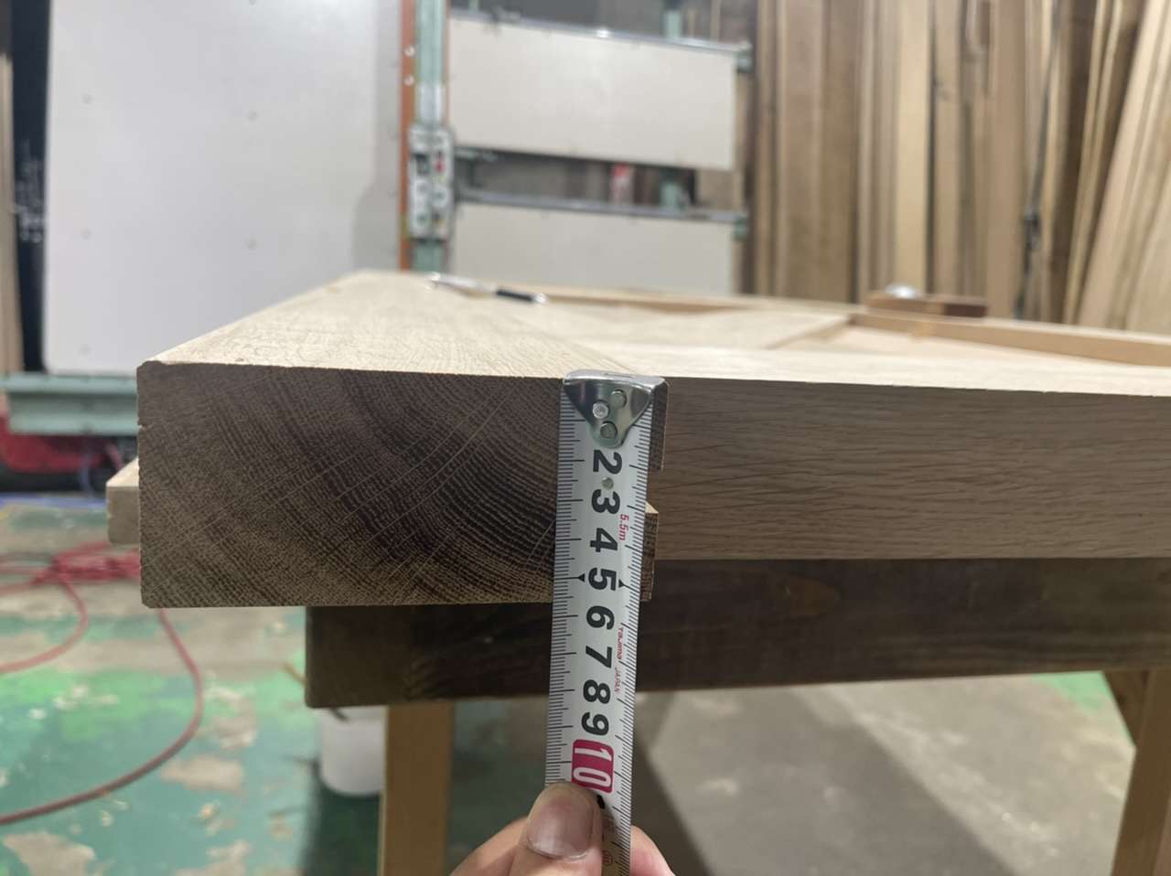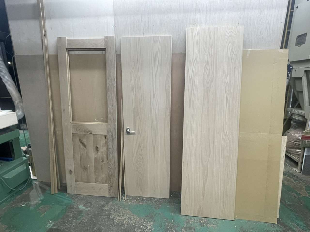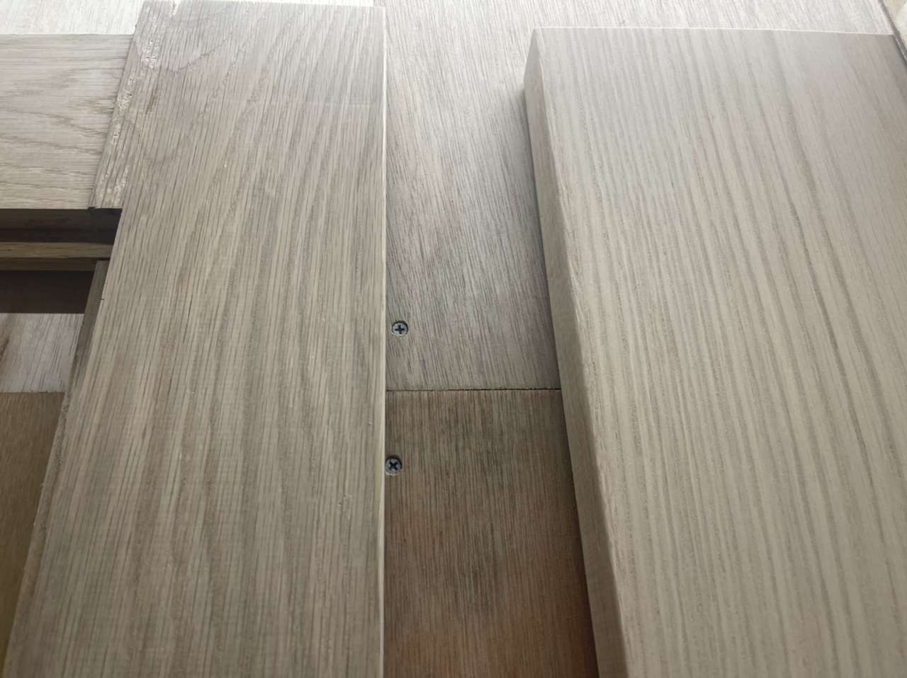 事務所の扉を作っております 2022/06/08 事務所移転に伴い工事中 オーク框ドア作ってます みんな大好きオークの扉作ってます サイズは2.4m×90センチ バーンドアのデザインです 厚み56ミリ 扉の框は極厚です ちょうどいいオークがあったので分厚いドアにしました 厚み56mm(普通の扉は30mm〜厚くても40mm)この厚みは防音ドアの厚みです♡ 全てホワイトオークの扉 節あり、節なしの表情の違いに注目! 全て同じ樹種です 一番左はオーク節有りの框ドア 上部にはガラスを入れます 右2枚はフラッシュ扉になります。 フラッシュ扉はオークの突板化粧合板仕上げで、こちらは節無しの王道オークの表情です 個人的には節有りのオークが大好きなので、節有りオークはまだ20枚以上板をストックしてます! どちらもホワイトオーク 並べてみるとよく分かります 左はオーク無垢材(節有り) 右はオーク突板化粧合板(節なし)扉の側面にはオーク無垢材を貼ってます(この部材は王手と呼びます) 産地によってもオークの色味は変わるし、木の中心なのか、外側なのかでも色味が変わります。 同じ木には見えませんね? 自己満ブログでした 笑 家具・什器工事