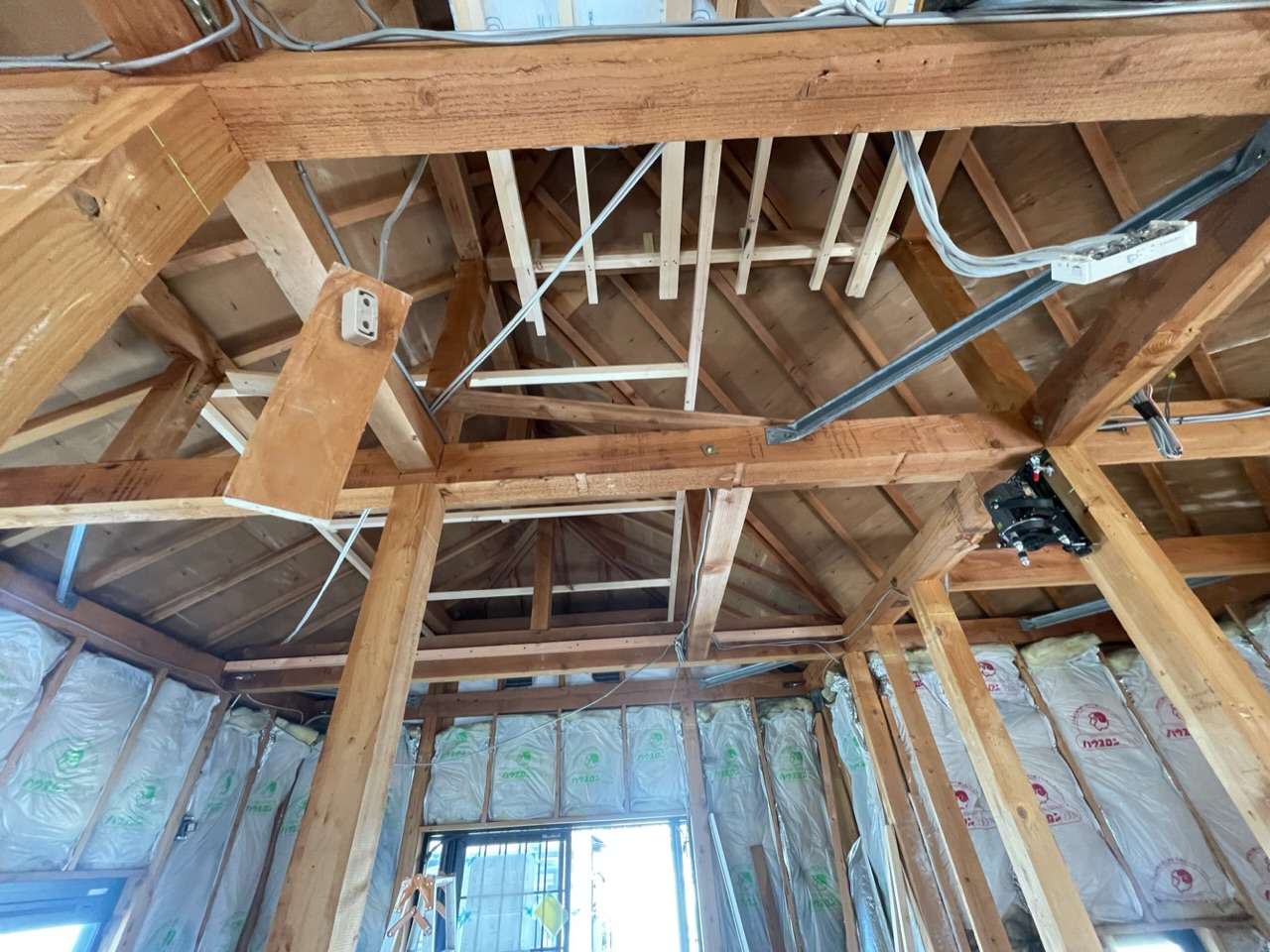 本日は天井下地 2023/01/19 高天井を組んでます 天井高4m超え 枚方市の現場です。 高天井を木下地にて組んで行ってます。 断熱も入れます。 高天井は断熱をしないと屋根からの熱がダイレクトに伝わります。 天井高4m超えの開放感は仕上がりが楽しみです ロフト収納も作ります 一部ロフト収納にする為二重で天井を組みます。