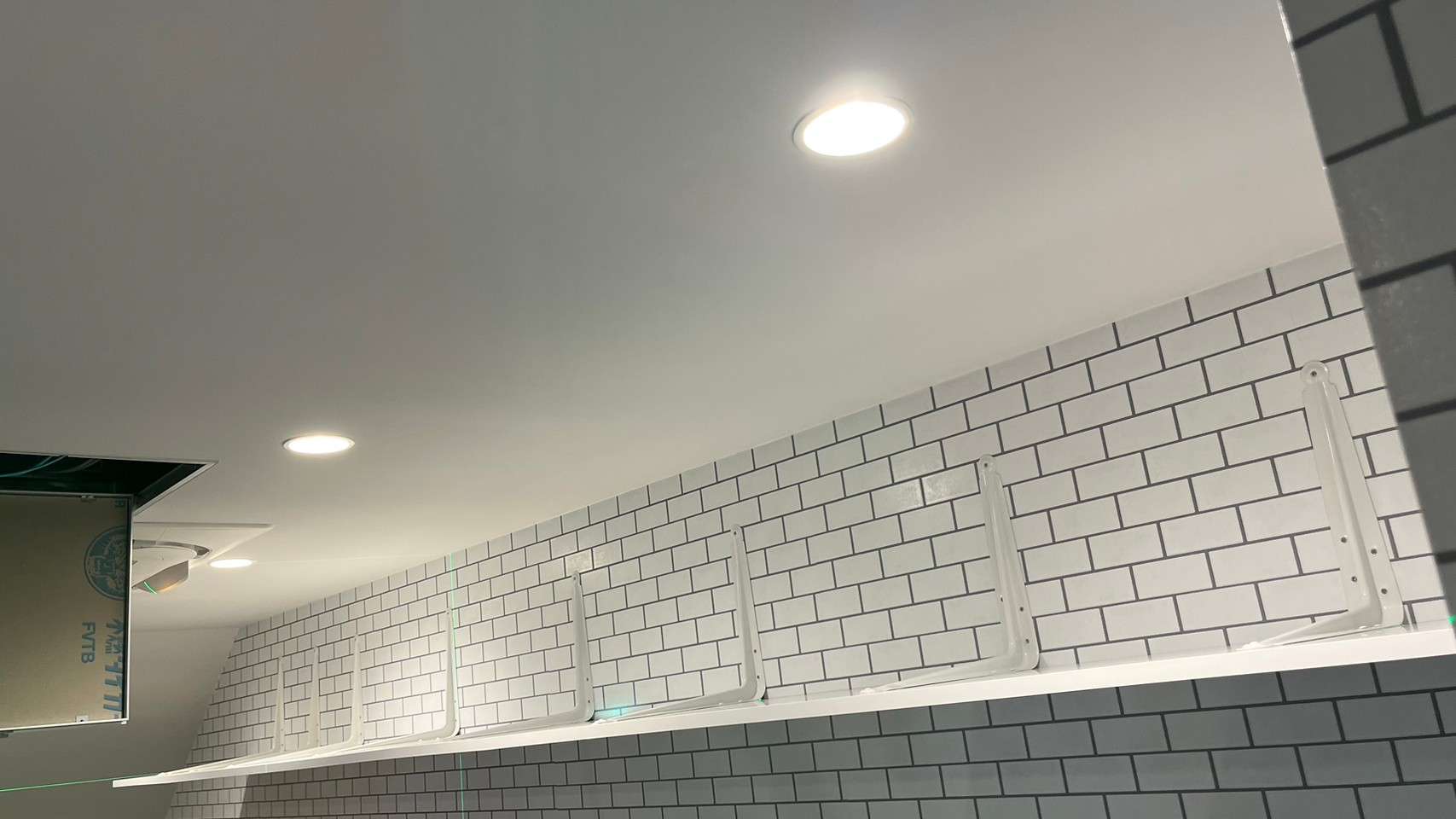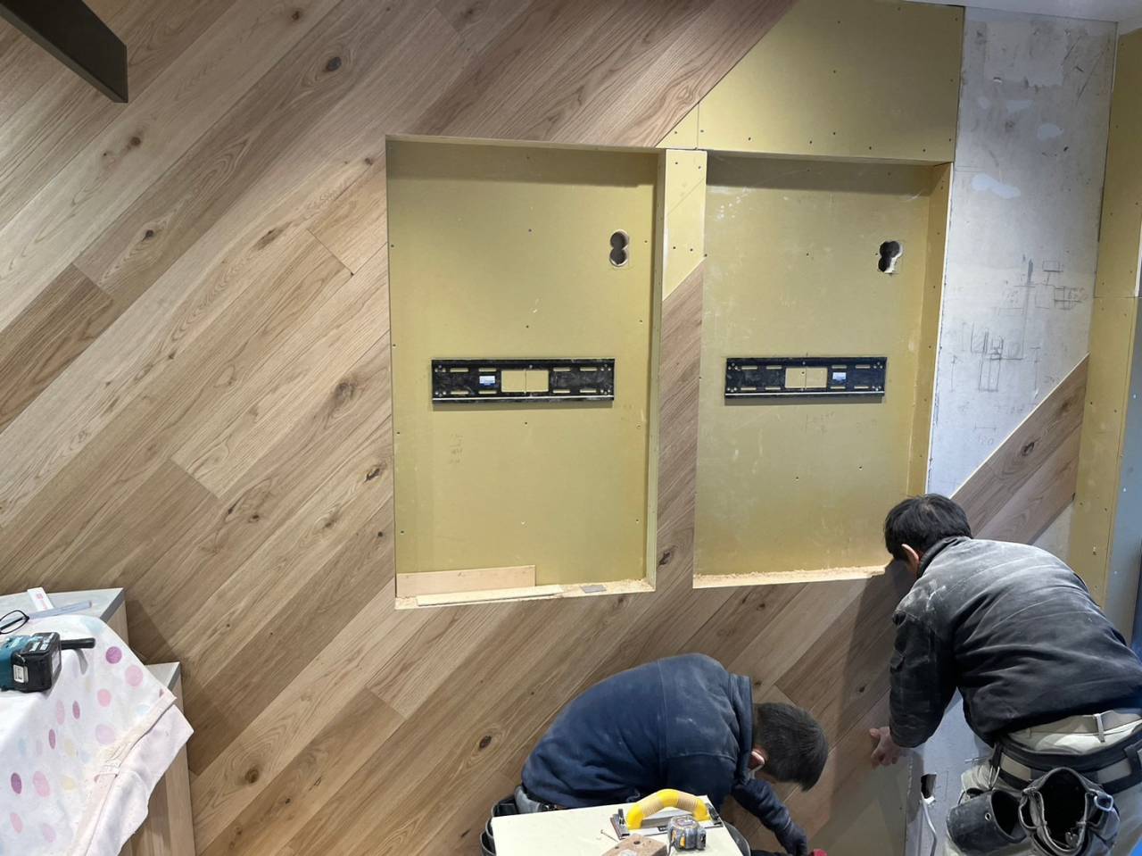 某タピオカ屋さんの仕上げ工事進行中 2023/02/04 京都の河原町にてタピオカ屋さんの仕上げ工事を行っています 大工はこんな事もやります 京都にて進行中の現場です。 某タピオカ屋さんの仕上げ工事です。 お店を作る大工である、店舗大工はこんな事をやっています。 棚を付けたり、家具を組み立てて取付したり、おしゃれな壁を作ったりします。 今日は壁に木のパネルを斜めに貼っています。 隙間が空かないように慎重に貼り進めます 細い部分は角度が変わらないように注意が必要です このように壁が途中で切れているとそこで角度が変わってしまう事があるので、角度が変わらないように印をしながら貼り進めます。 他には扉を付けたり、床を張ったりしてます。 背面のタイルがかわいいですね 棚の取付 店舗工事