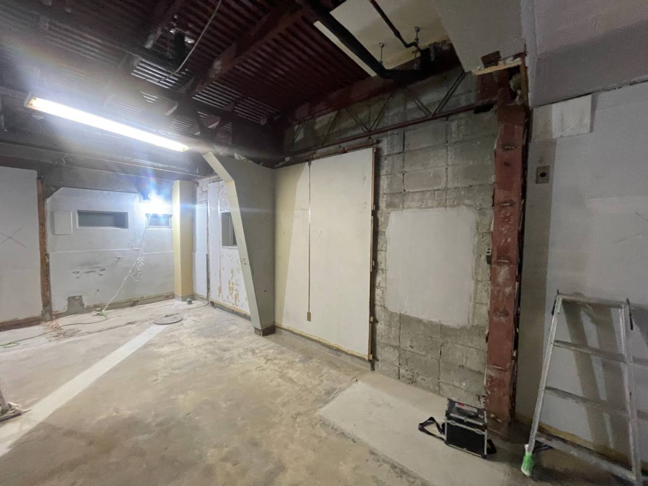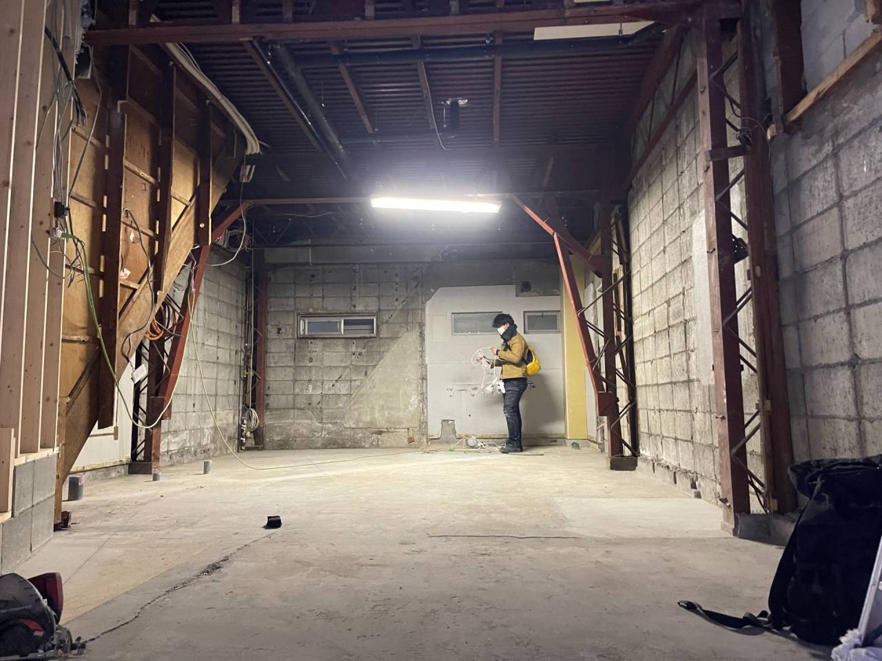 こういう状態がフルスケルトンと言います。何もない状態です。ちなみにこちらの現場は照明は工事用の仮設照明のみ、分電盤は有りです。