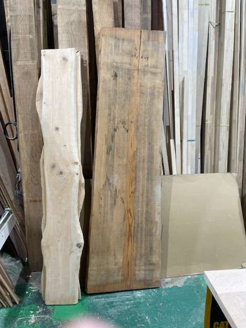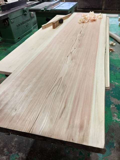 テーブル天板仕上げました 2023/02/17 杉のテーブル天板を仕上げております お客さんの支給品です 施主支給の天板 お客さん支給のテーブル天板を仕上げております こちらは現在進行中のリノベーションの現場に設置されるテーブルの天板となります。 樹種は杉です。 弊社は工務店として現場での工事を行なっていますので、大工工事と共に家具工事をお願いされる事もあります。 今回はお客さまのこだわりのテーブル天板を弊社で仕上げさせていただき、支給品のテーブル脚に据付を行います。 テーブルやカウンターの一枚板は弊社にも在庫がありますが、持ち込みでの加工も承っておりまふを カンナ掛け中です 丁寧にカンナ掛けを行います 削る前の一枚板 削る前はこんな感じの見た目です