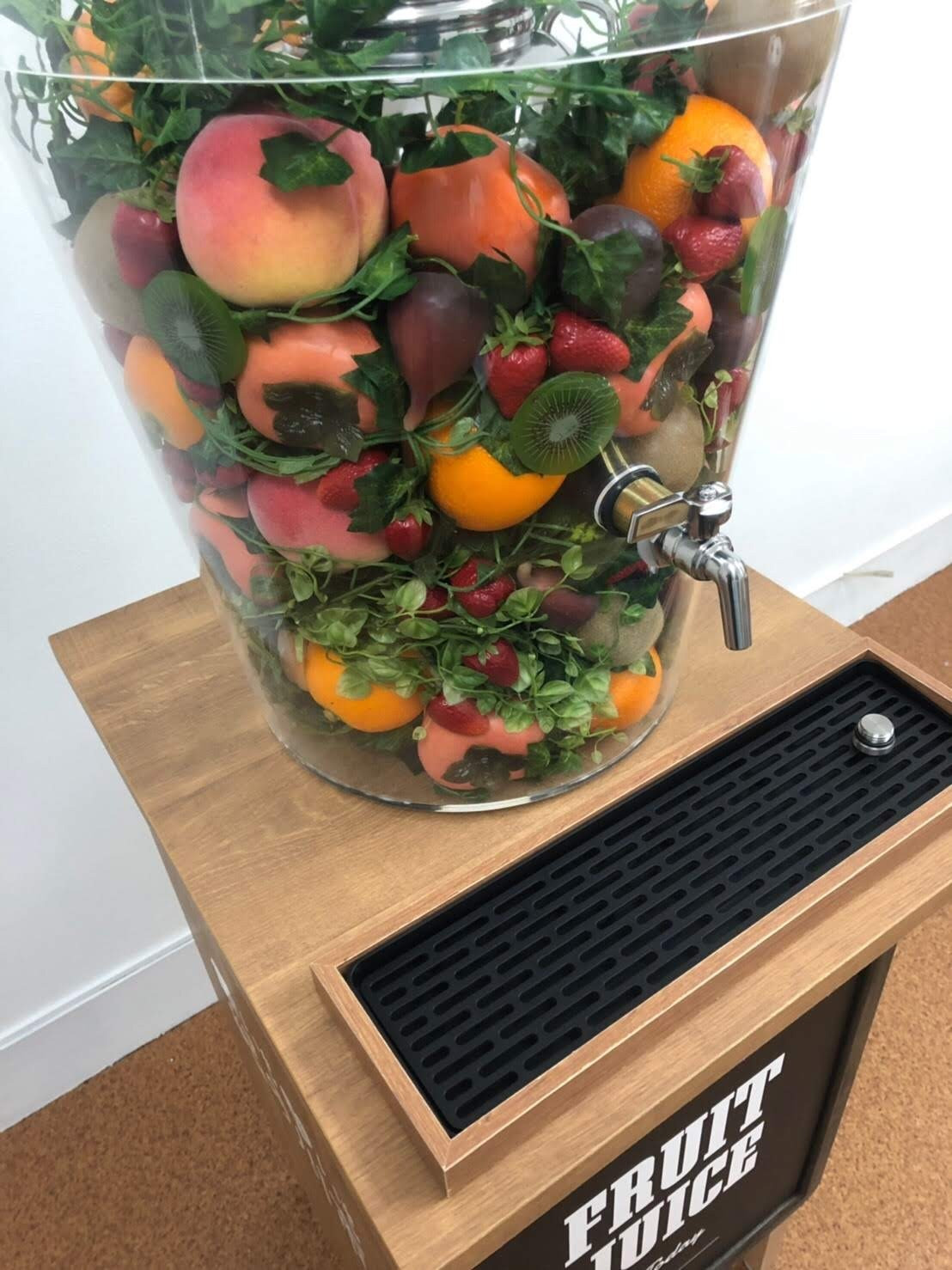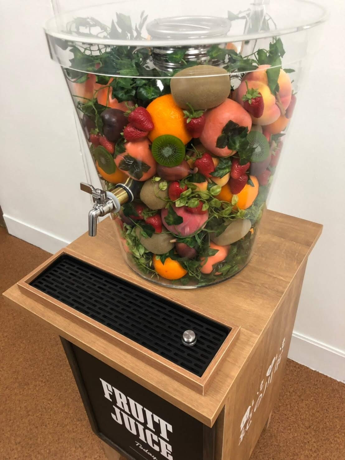 そこで、アクリルでバケツ状の箱を製作し、実際に蛇口を取り付け、みかんジュースを注げる仕様にしています。